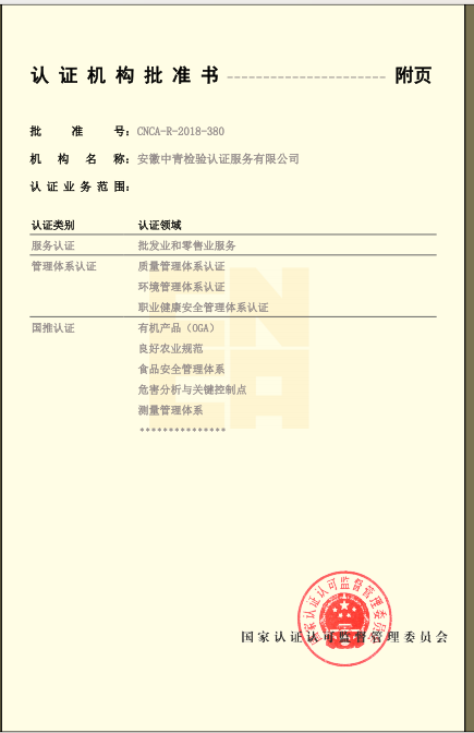 安徽中青檢驗(yàn)認(rèn)證服務(wù)有限公司成立于2017年6月6日,2018年1月3日通過國家認(rèn)證認(rèn)可監(jiān)督管理委員會批準(zhǔn),現(xiàn)認(rèn)證領(lǐng)域:質(zhì)量管理體系、環(huán)境管理體系、職業(yè)健康安全管理體系、食品安全管理體系、HACCP管理體系、有機(jī)產(chǎn)品認(rèn)證、良好農(nóng)業(yè)規(guī)范、服務(wù)體系、醫(yī)療器械質(zhì)量管理體系、企業(yè)誠信管理體系、食品工業(yè)企業(yè)誠信管理體系、食安安徽品牌等類別認(rèn)證。